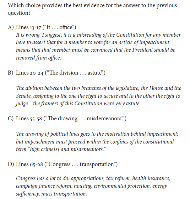 5. 新题型:证据使用能力题。有些题目不但要求学生选出正确答案,还要选出在原文中支持自己选择的证据。每套阅读考试的52道题目中,会有10道是证据使用能力题。在每套写作和语言考试部分的44道题目中,会有8道是证据使用能力题。即在阅读部分的考试中,96道题目中,会有18道证据使用能力题。例题如图: