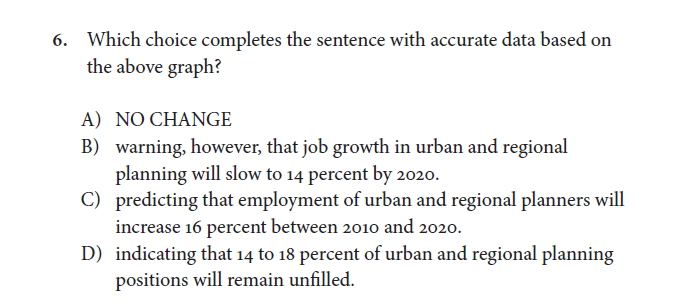 4. 新题型:图表解读题。新SAT强调对数据图表的解读能力。在阅读部分,学生要将文本内容和数据图表展现的内容结合起来理解答题;在Writing and Language TEst部分,学生需要根据图表信息对文章进行修改,发现文章对图表信息诠释错误的地方,判断图表信息和文章信息的相关性。图表出现的频率为每套阅读考试中会出现2-3个图表,每套写作和语言考试中会出现一个图表,共计3-4个图表。