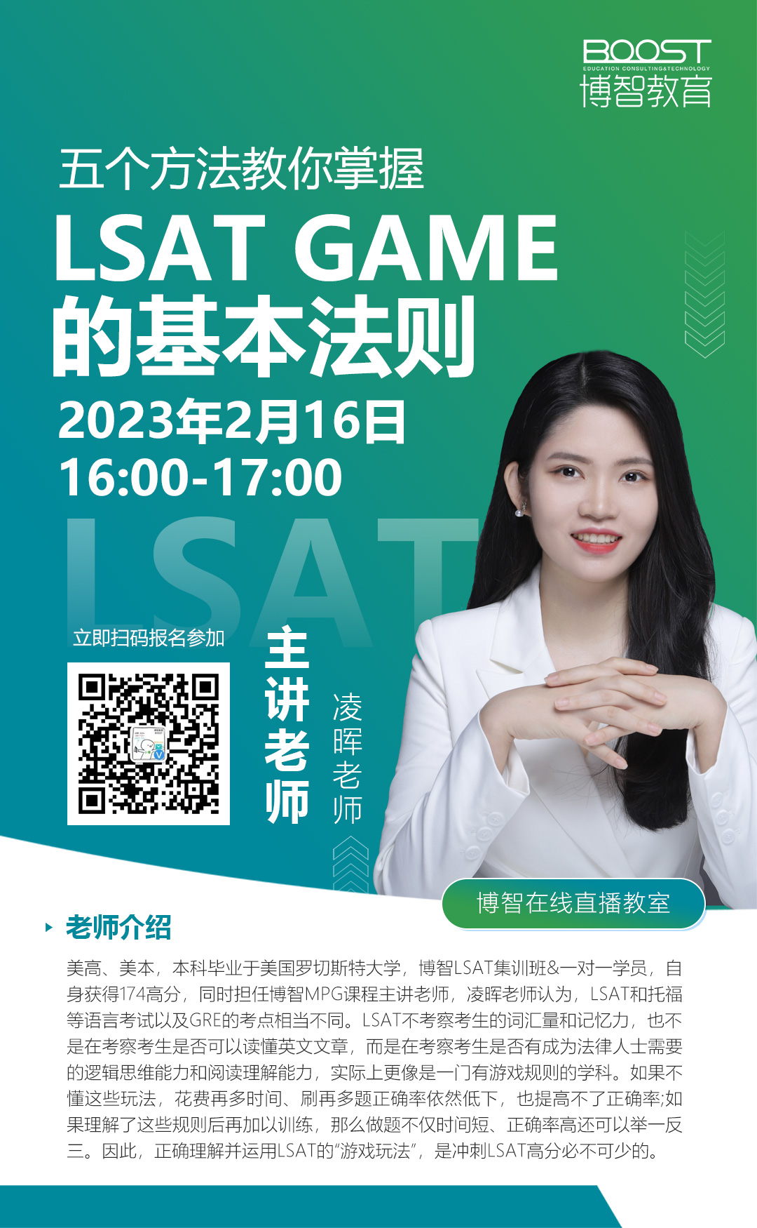 凌晖老师,本科毕业于美国罗切斯特大学,LSAT174分,同时担任博智MPG课程主讲老师。凌晖老师认为,LSAT跟托福等语言考试以及GRE的考点相当不同。LSAT不考察考生的词汇量和记忆力,也不是在考察考生是否可以读懂英文文章,而是在考察考生是否有成为法律人士需要的逻辑思维能力和阅读理解能力,实际上LSAT更像是一门有游戏规则的学科。如果不懂这些玩法,花费更多时间、刷再多题正确率依然低下,提高不了正确率;如果理解了这些规则后再加以训练,那么做题不仅时间段、正确率高,还可以举一反三。因此,正确理解并运用LSAT的“游戏玩法”,是从此LSAT高分必不可少的。
