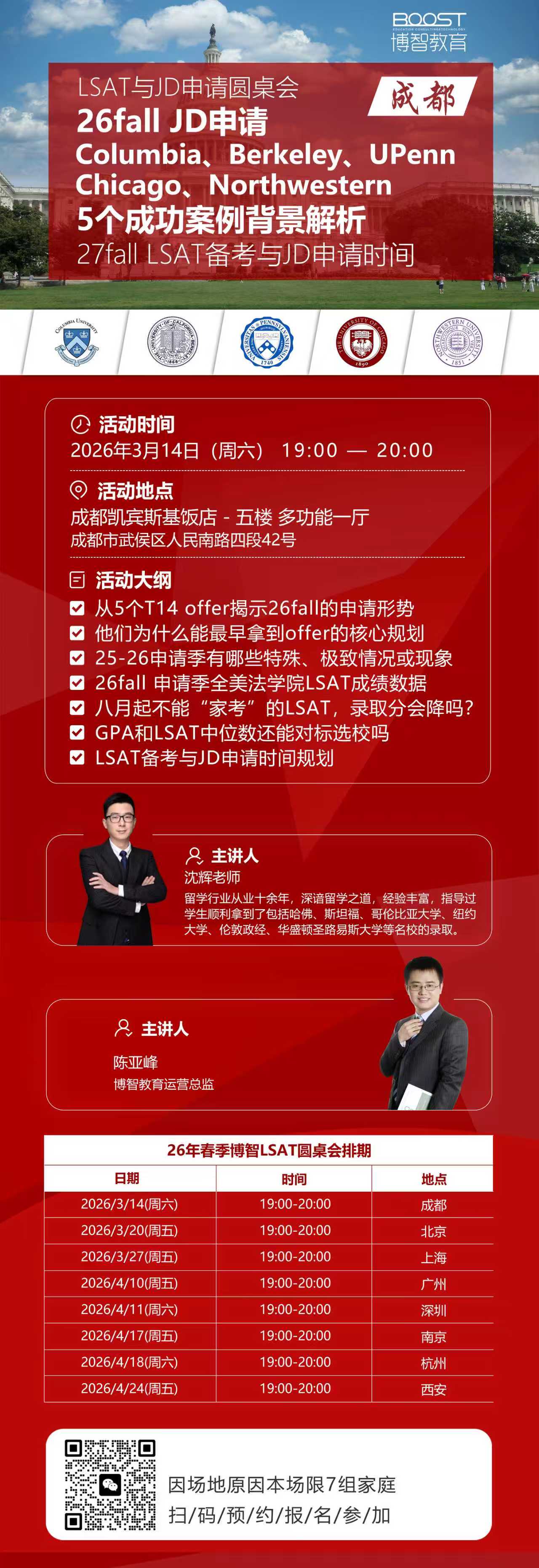 博智教育特别策划「LSAT 与 JD 申请圆桌会全国巡讲」,届时陈亚峰老师和沈辉老师会深度解析博智T14申请成功案例,为你拆解申请逻辑,规划备考路径,让你在 27fall 申请季中抢占先机。