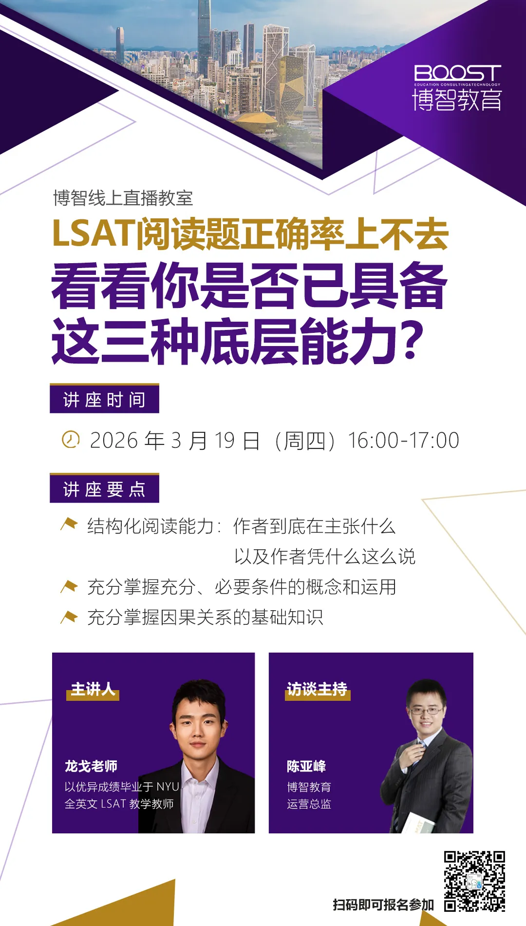 扫描下方海报中的二维码添加小博微信,回复“LSAT阅读讲座”即可免费参加!